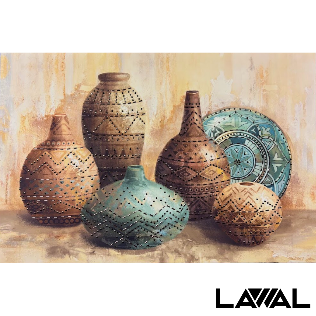 Cuadro con Relieve Diseño Vasijas Étnicas. Un arte lleno de calidez y estilo, con vasijas en tonos tierra y turquesa que destacan por su relieve y textura. Ideal para dar un toque artesanal y acogedor a tu hogar.