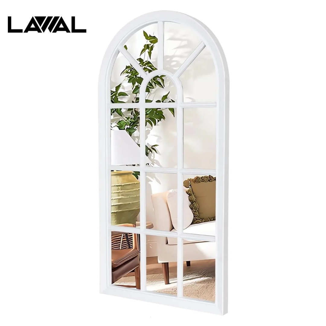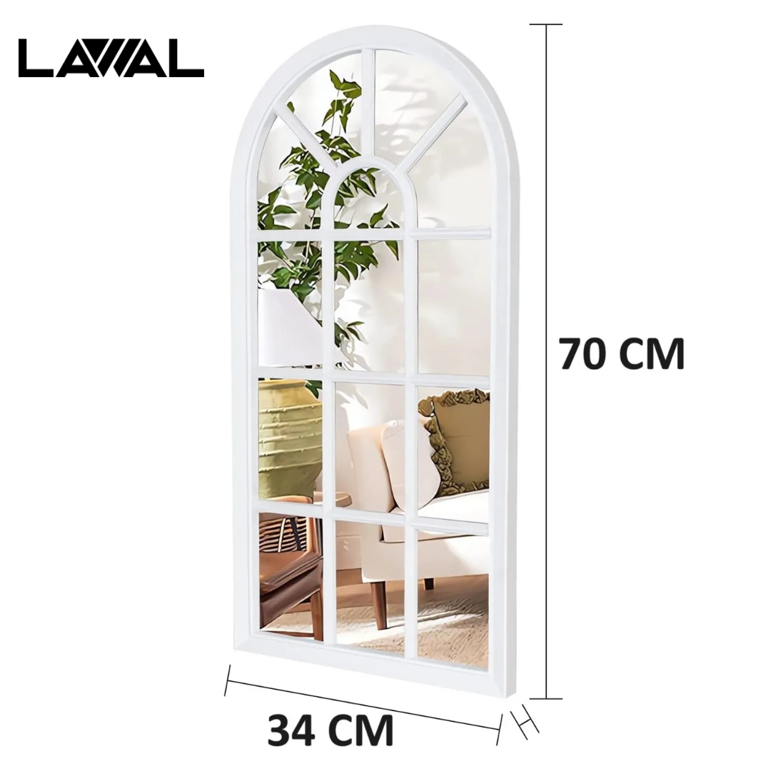 Un espejo que ilumina y decora estilo ventana arqueada es la pieza perfecta para dar elegancia, amplitud y un aire clásico a cualquier espacio de tu hogar. Marco de WPC, imitando madera con arco superior y divisiones tipo ventana clásica. Cristal seccionado que refleja y amplía la luz. Medidas: 70 cm alto x 35 cm ancho. Color blanco.